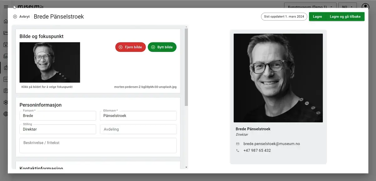 Man kan også knytte en side til den ansatte (f.eks. mer infor og oversikt over publiserte tekster) og/eller en ekstern side.