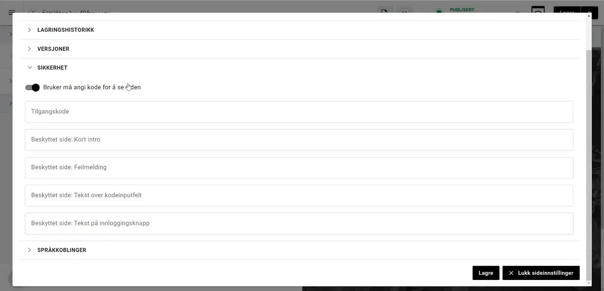 NB! Koden/passordet som blir lagt inn når man "låser" en side forsvinner fra feltet, så dette bør noteres og distribueres til de som eventuelt skal ha tilgang til å lese.