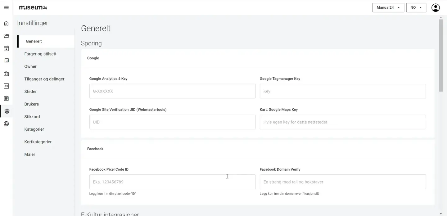 Dette er bl.a. koder for sporing/analyseverktøy (Google Analytics, Facebook m.m.), og nøkler for kobling mot eKultur (KulturPunkt, DigitaltMuseum m.m.). Under "Innstillinger" kan man også opprette og administrere stikkord, kortkategorier m.m.