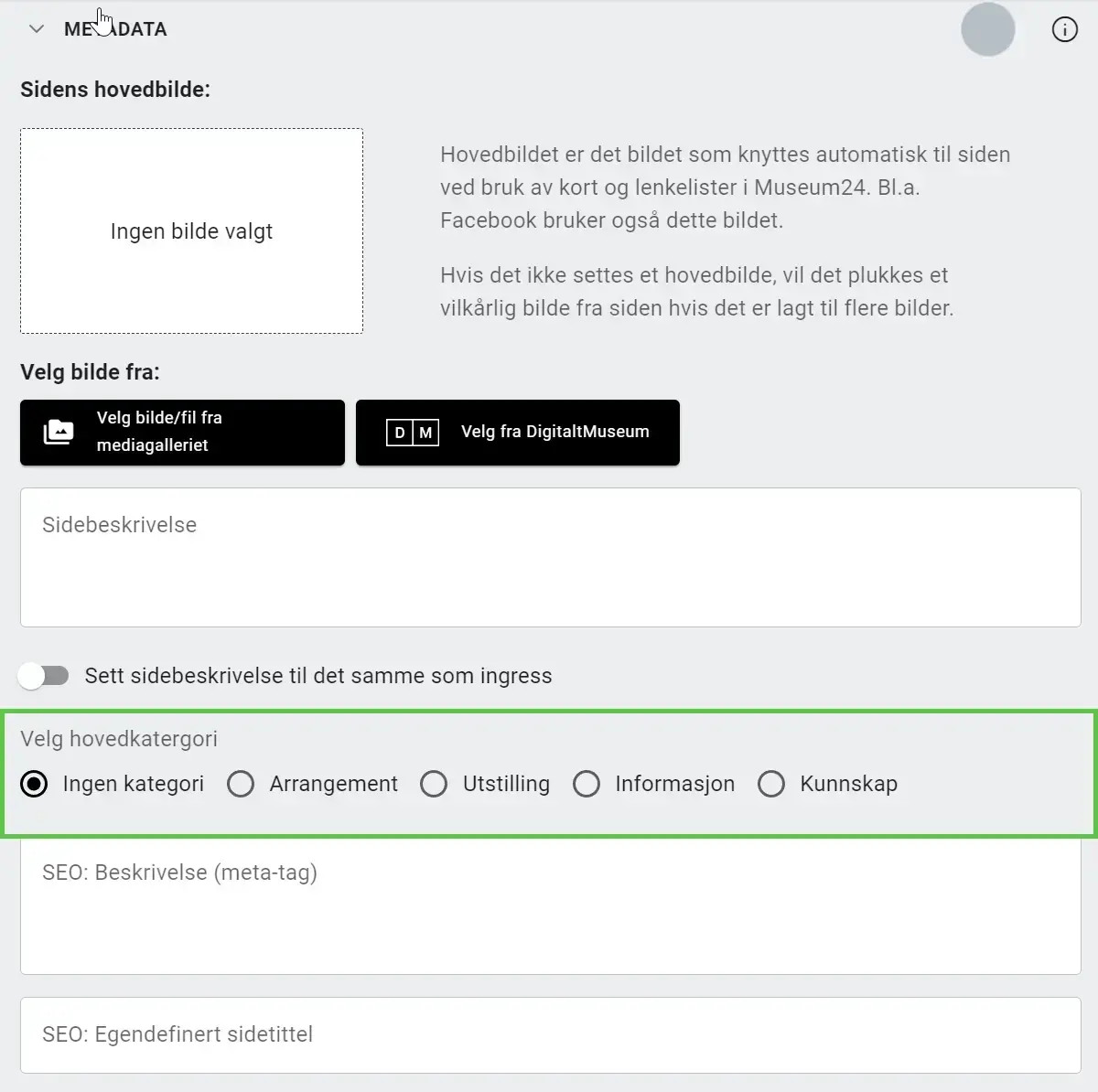 NB! Kategoriene som ligger som standard kategorier er felles for alle nettsteder i Museum24, og kan ikke endres redaksjonelt. Det som tidligere het "kategorier" i Museum24 1.0 heter nå "Kort-kategorier", og brukes til å liste ut lenker/kort der det er behov for andre kategoriere og utlistinger som går ut over standard kategorier. Mer om denne endringen HER: