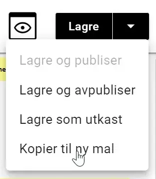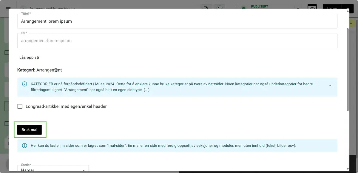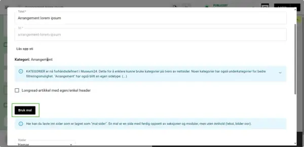 NB! Ved å lime inn mal på en side vil denne overskrive det innholdet og oppsettet som evnt. allerede er lagt inn, så dette er noe som anbefales å gjøre før man har begynt å legge inn innhold på siden man jobber med. Metadata (hovedbilde, sidebeskrivelse og SEO) og kategorier vil ikke lagres ned i malen.