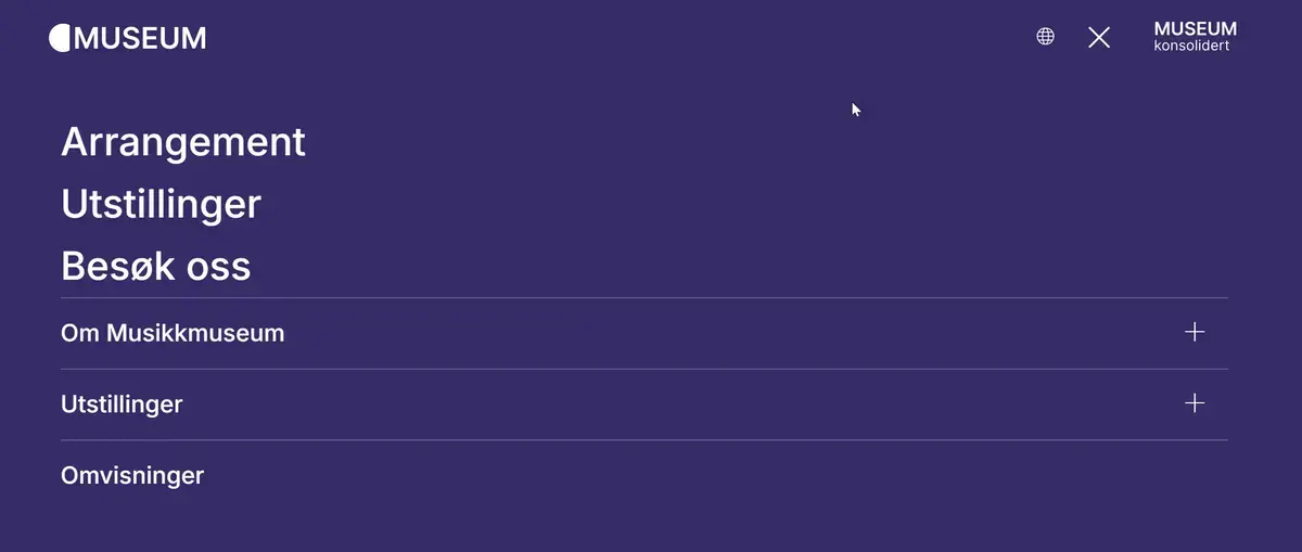 Man har også mulighet til å lage en fokusmeny til nettsiden. Dette kan være hensiktsmessig hvis man har mange hovedpunkter i menyen som gjør den lang. Da kan man f.eks. løfte frem punkter som Besøk oss, Hva skjer og Billetter, eller tilpasse disse etter behov og sesong. Hovedmenyen er da tilgjenglig fra hamburgermenyen.