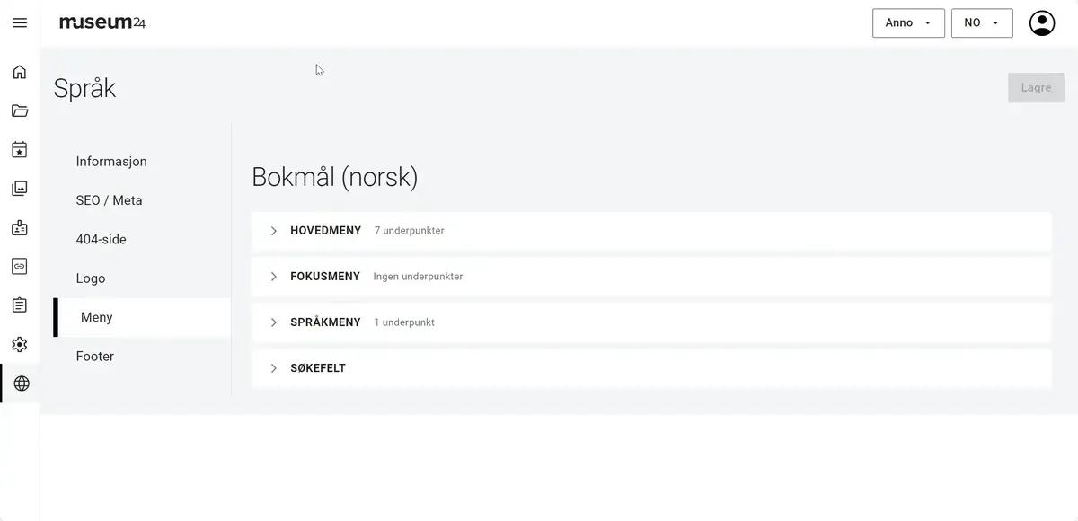 Her kan man manuelt legge til, fjerne og endre rekkefølgen på menyen. Menyen har 2 nivåer. Det er ingen sammenheng/automatikk mellom innholdsstrukturen under "Innhold" i admin og nettsiden. Dermed kan en side som ligger langt nede i innholdsstukturen (f.eks. på nivå 3), løftes frem som et egen hovedpunkt i menyen.