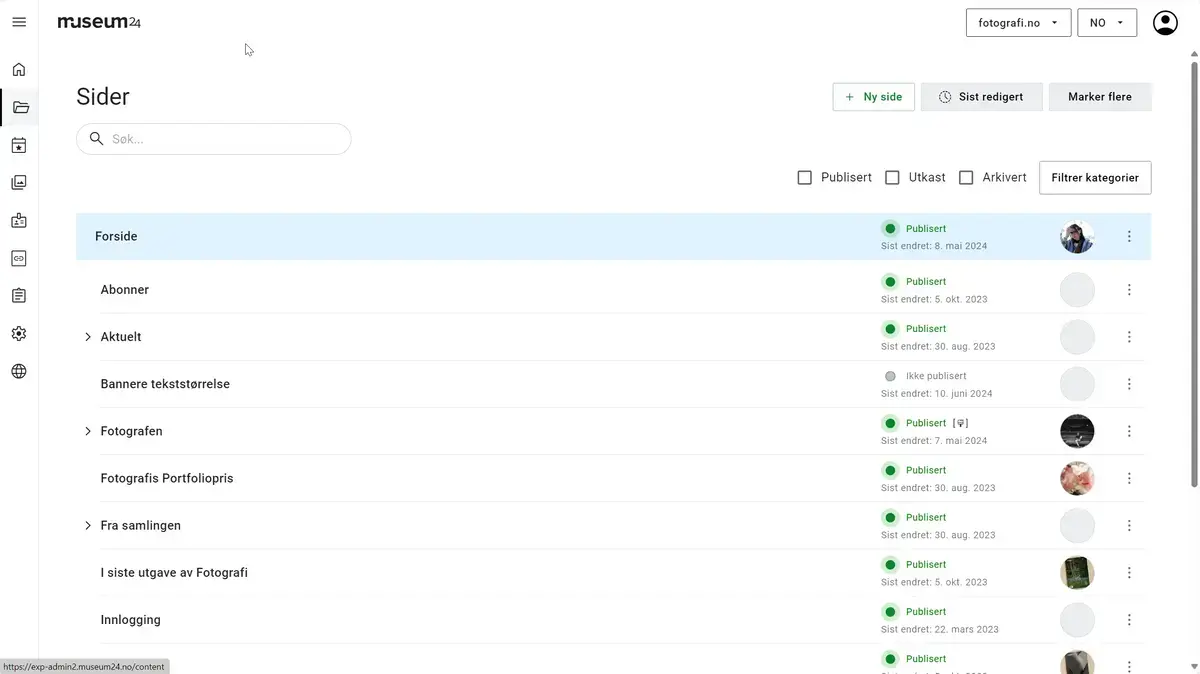En side kan ha status som "Ikke publisert", "Publisert" og "Arkivert". Sider kan publiseres/avpubliseres enten i lagrekanpp øverst til venstre i editor, eller rett fra sideoversikten under "Innhold/Sidetre".