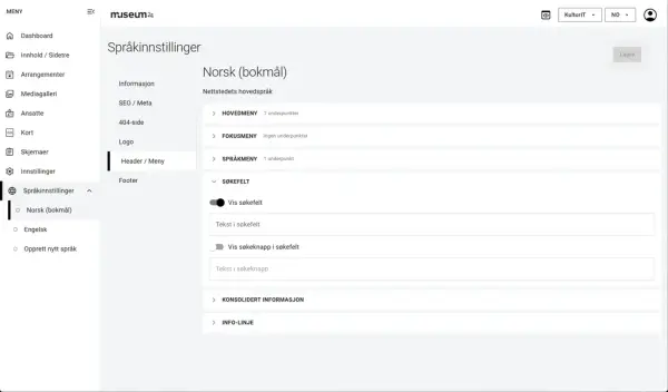 Søket kan legges til for hver språkversjon man har av nettsiden, slik at man f.eks. kan velge å ha søkefunksjon på museets norske nettsider, men ikke på de engelske sidene.