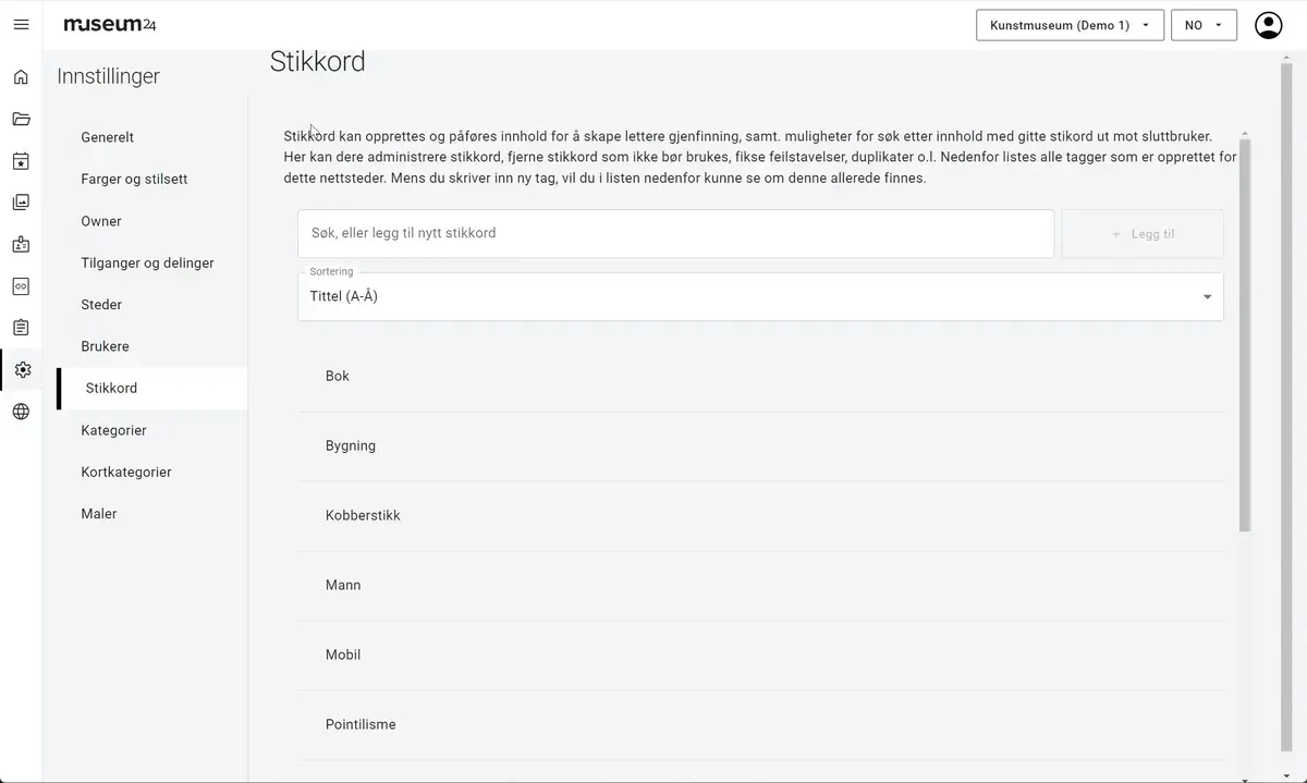Stikkordene opprettes og administreres under "Innstillinger > Stikkord". Man kan også opprette nye stikkord når man laster opp bilder eller i media-editoren. Det er allikevel anbefalt å sette opp en god stikkordsliste fra starten av, slik at man ikke har altfor mange stikkord å forholde seg til.